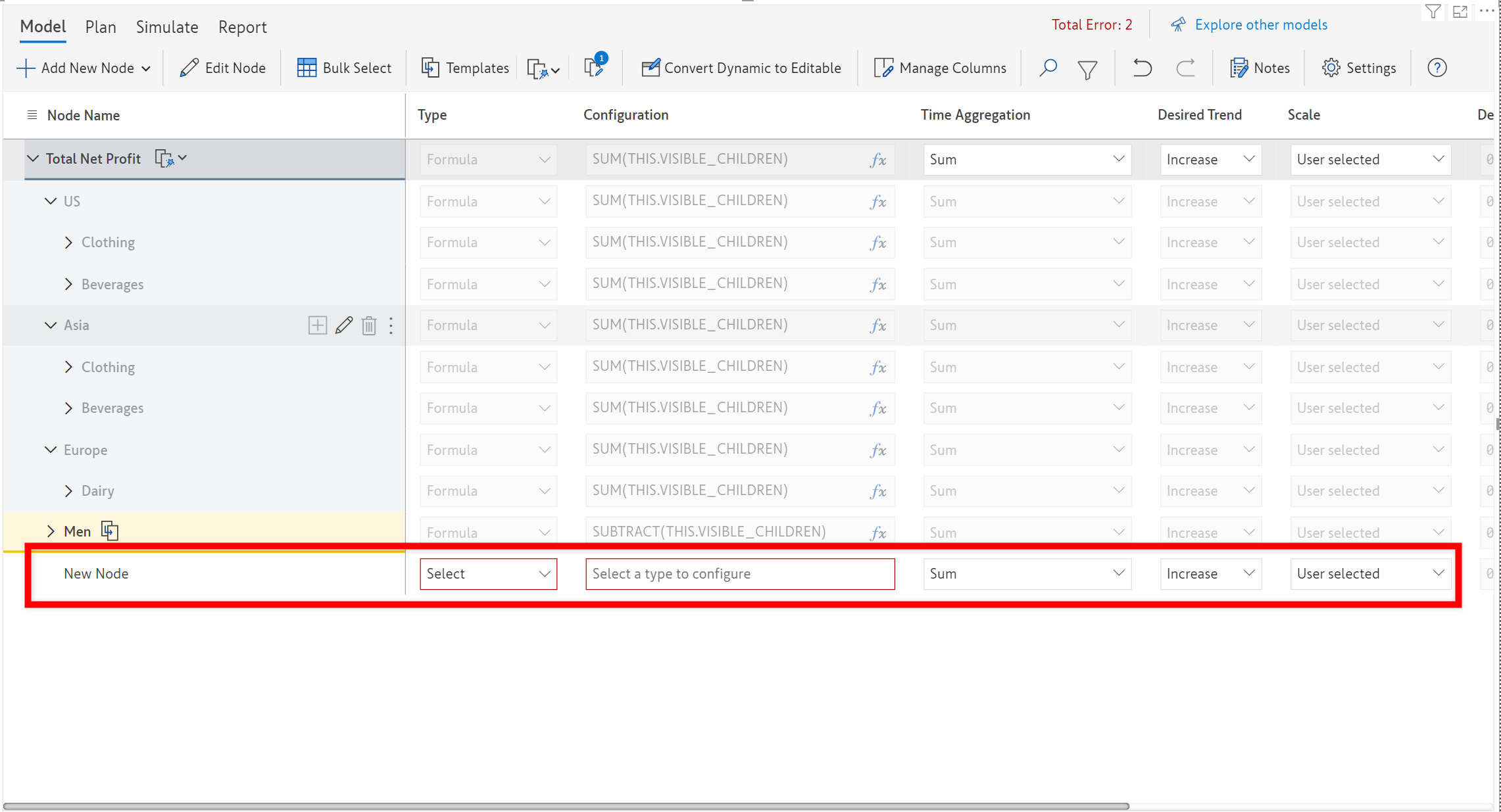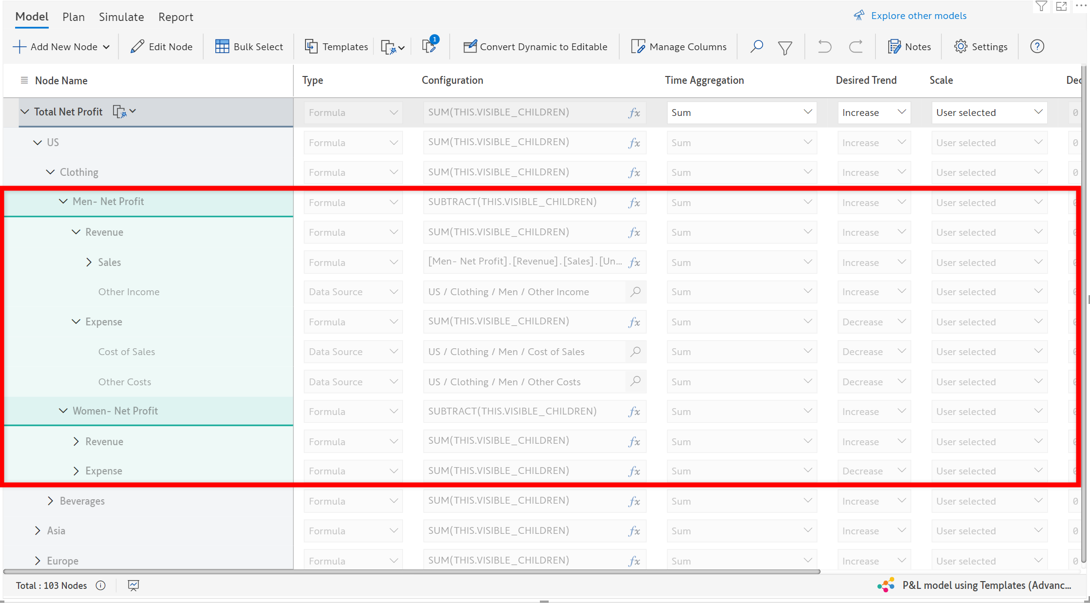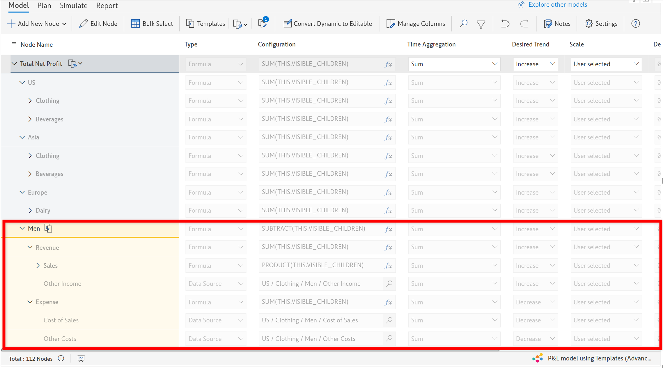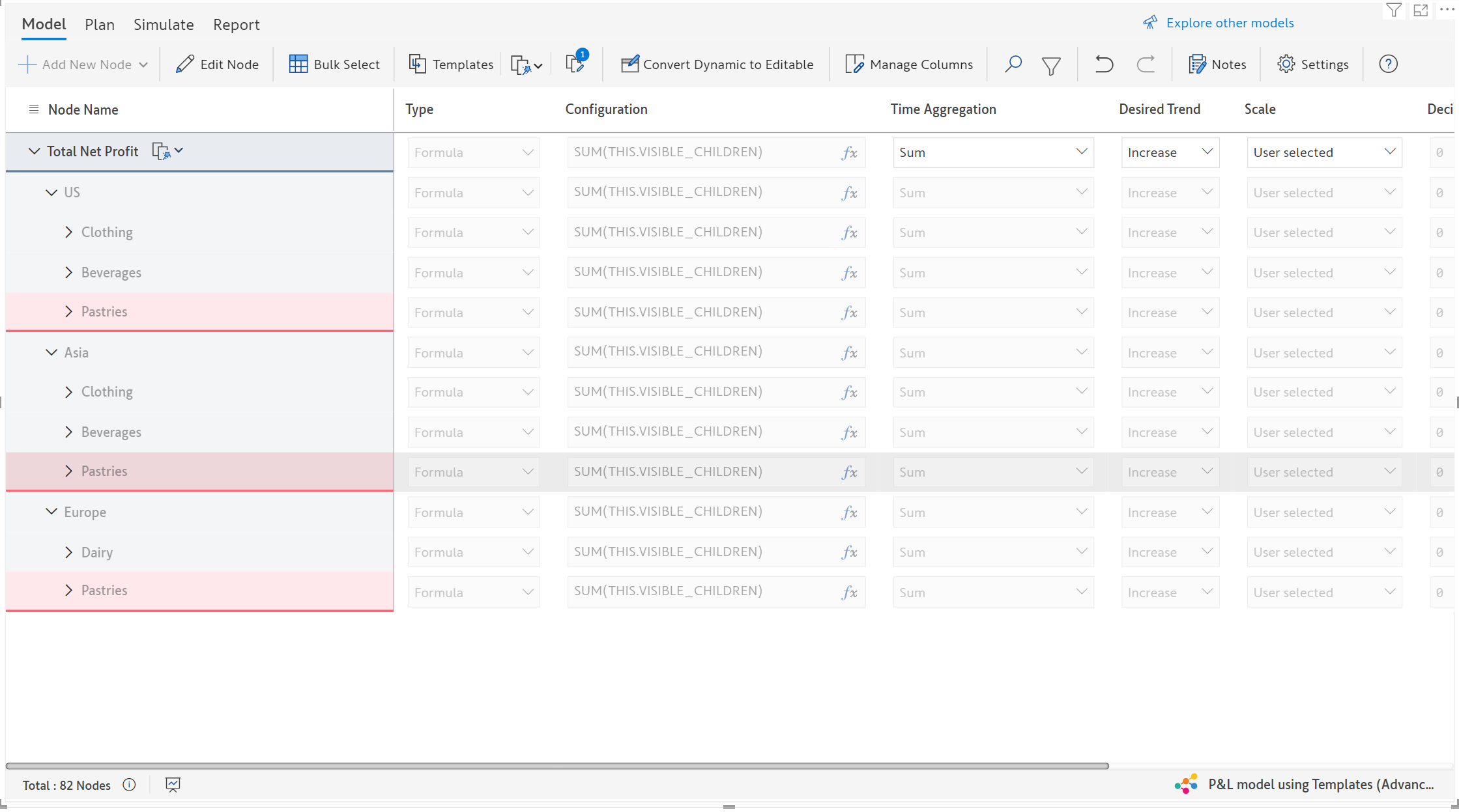 In the following example, the template ‘*Pastries*’ is added to the dynamic model at each *Region* level.