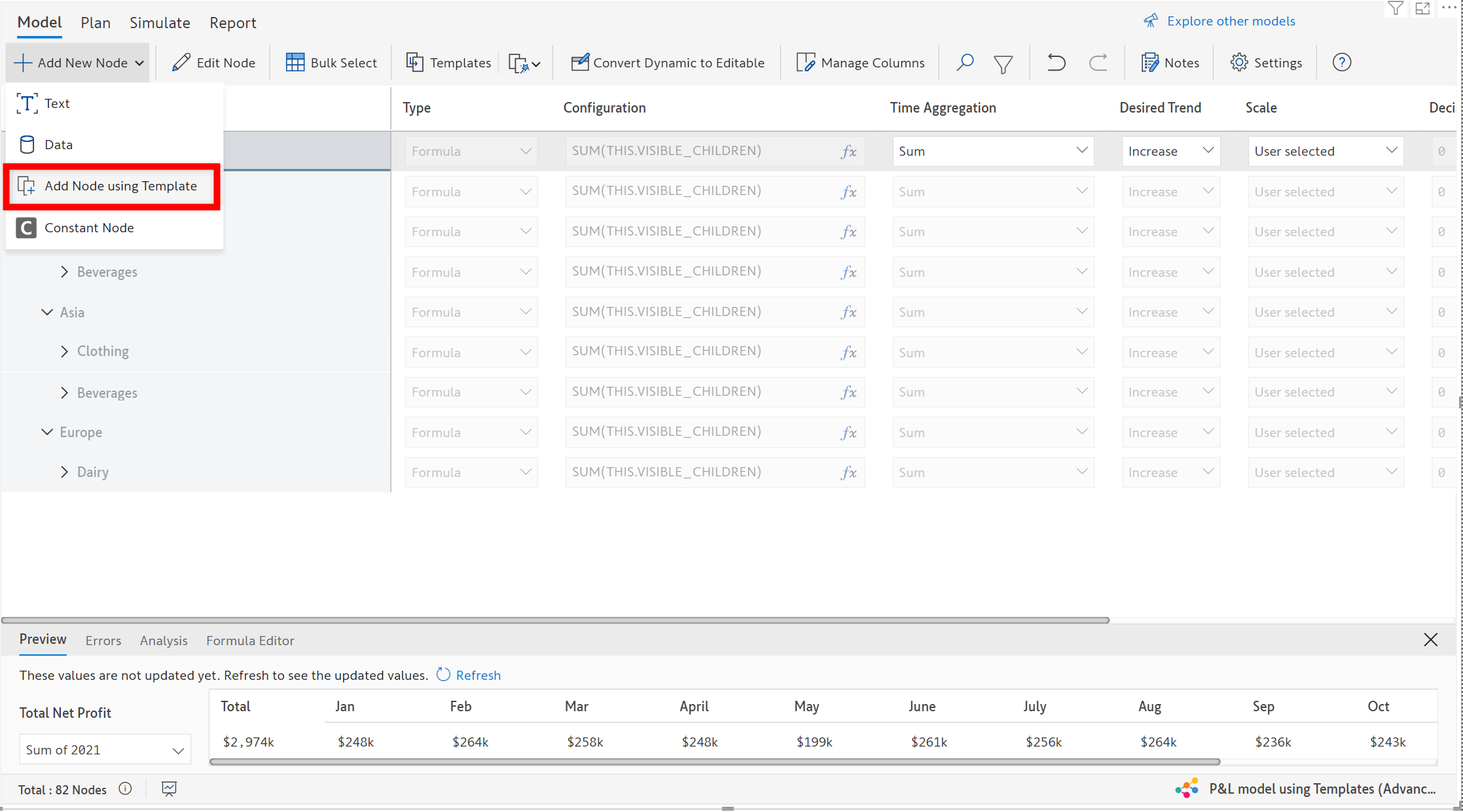 Find below the image of a dynamic model with a template added using **Add New Node-> Add Node using Template.**
