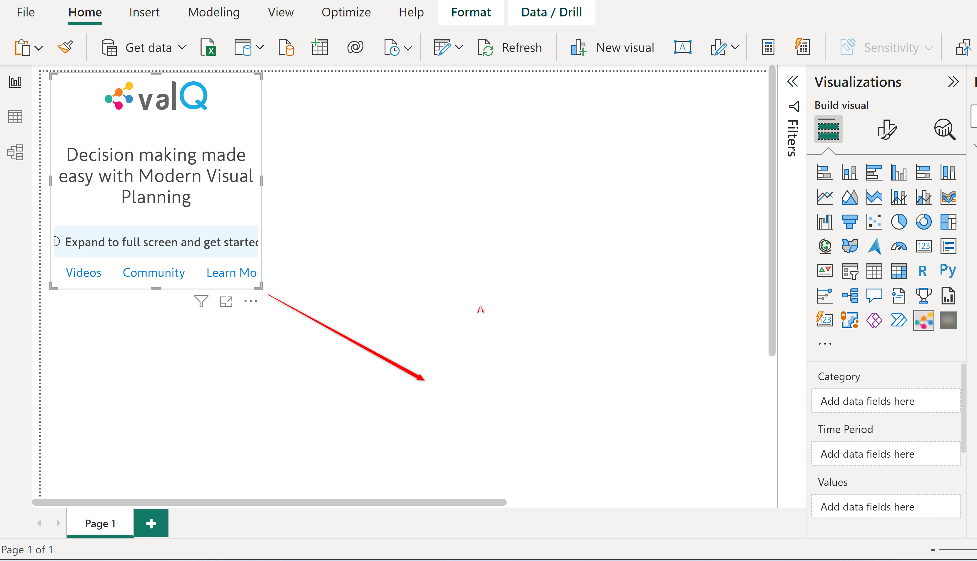 The first step to using ValQ is to add it to the Power BI canvas. Click on the ValQ icon in the visualization pane.&#x20;
