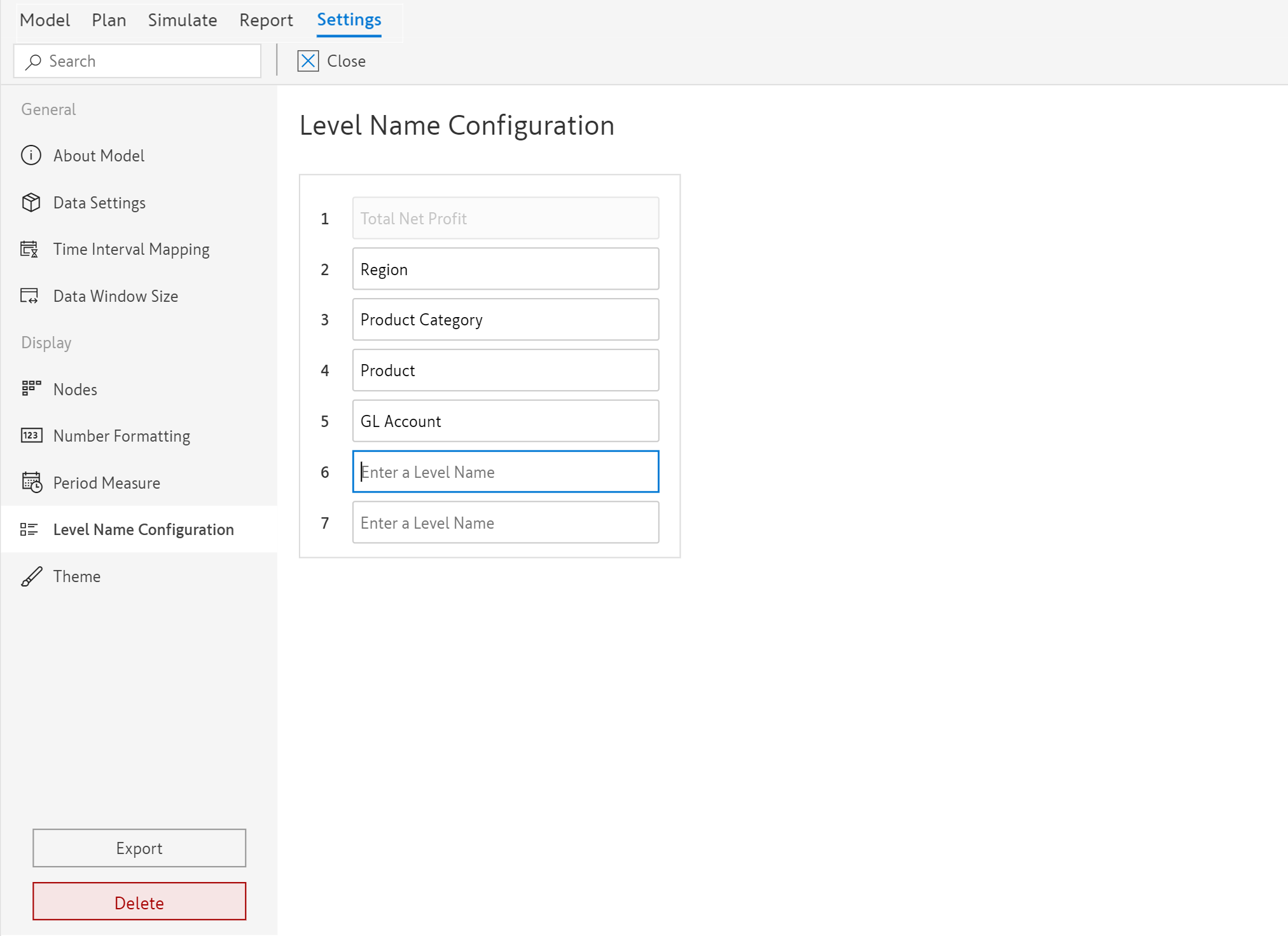 With the Period Measure menu, the labels of time period measures such as Till Period, All Periods and Simulation Period can be renamed.