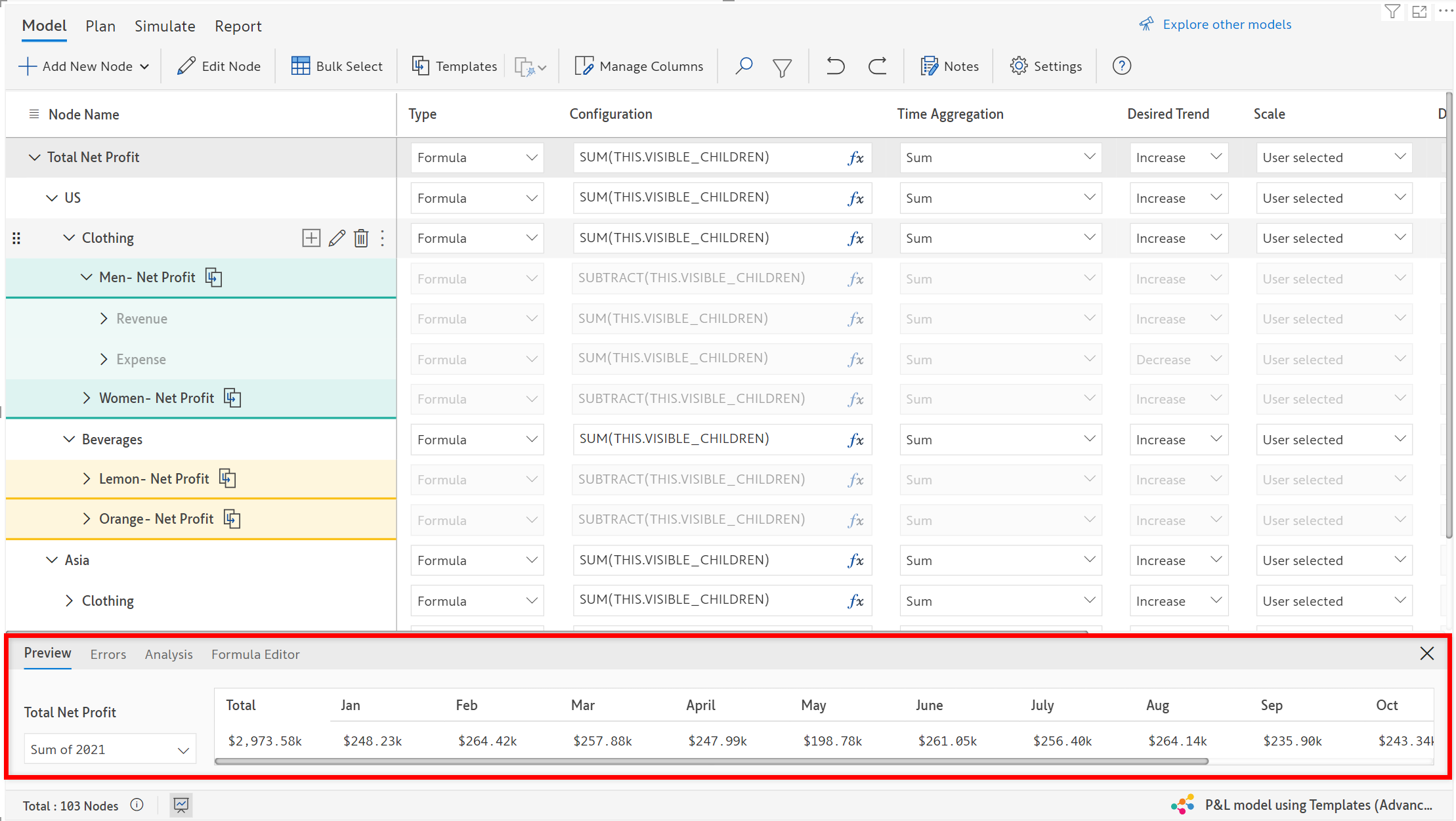 The first one is the **Preview** section which displays the total and period values of the node selected by the user.