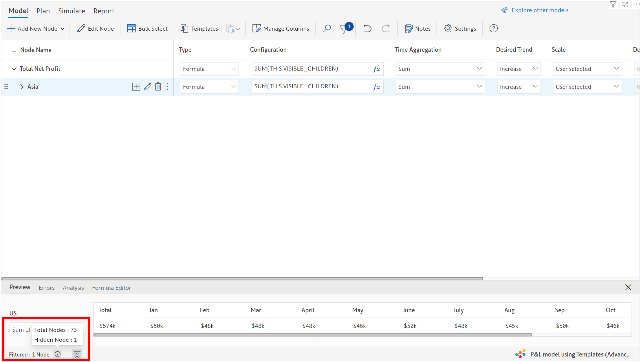 The bottom panel of the model tab provides necessary information about the model such as node count, preview of the node value, errors on the model, analysis of the model, formula editor and the model name.