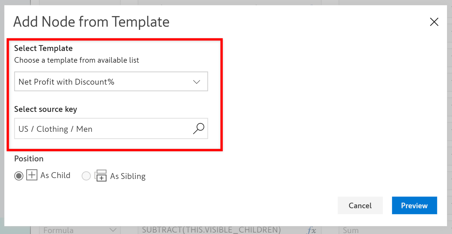 6. Choose the source key from the list and the position of the template to be added as a child or sibling of the selected node.