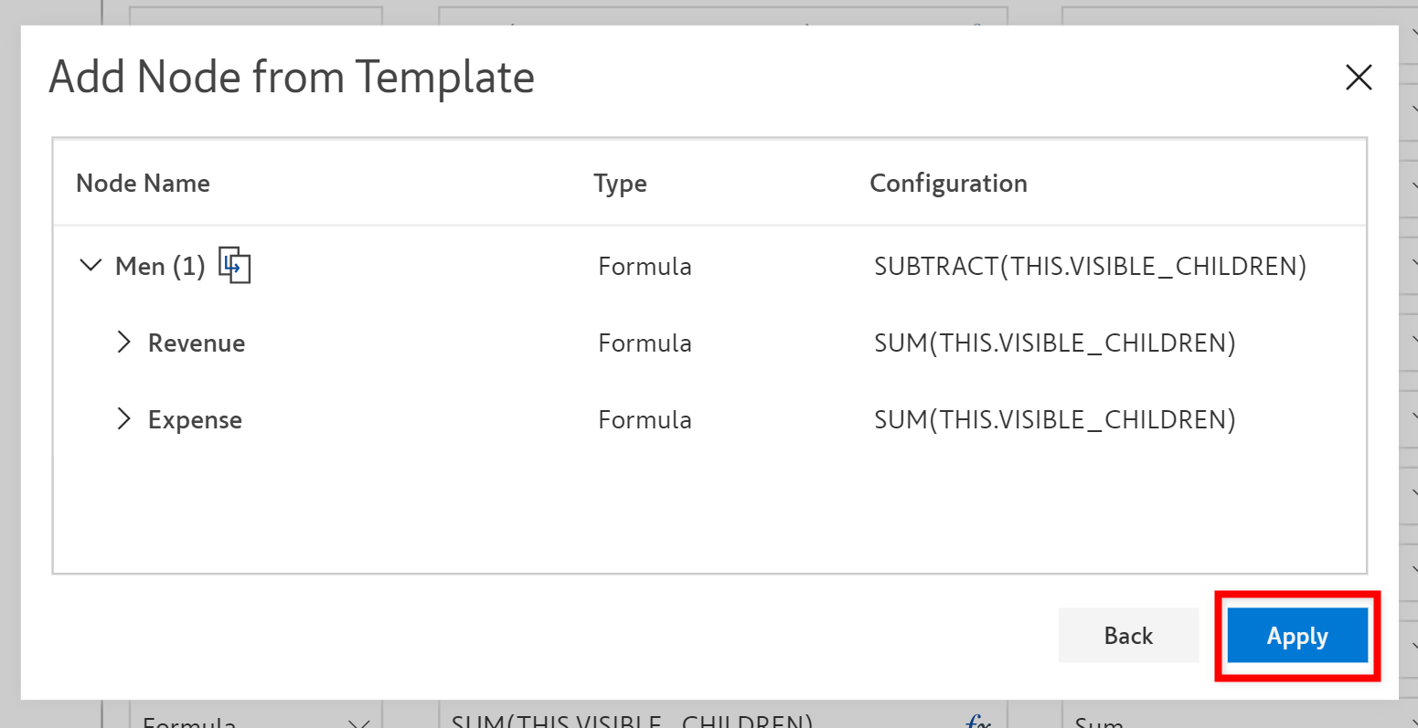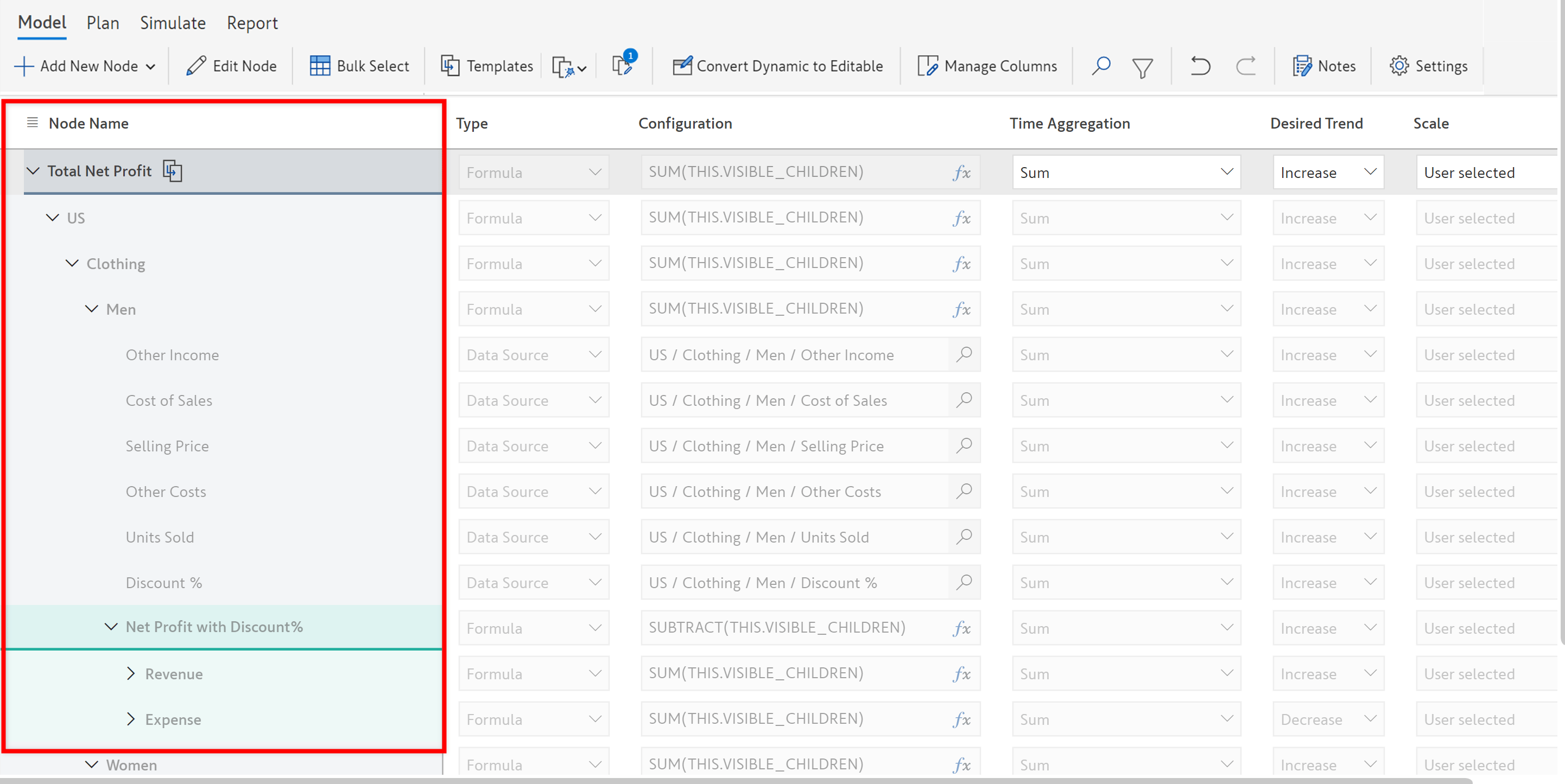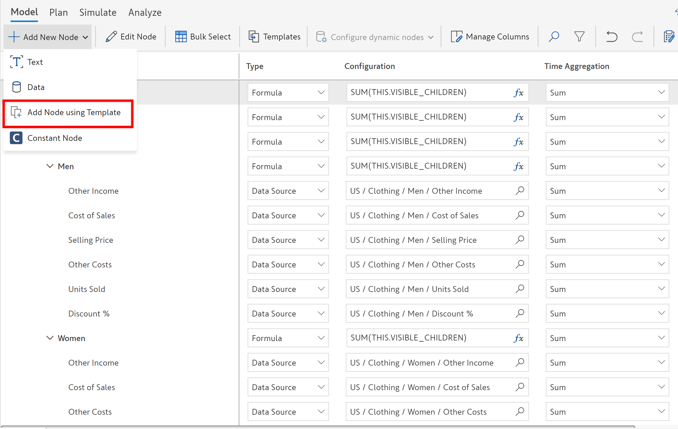 E.g. '*Men'* node is renamed to *'Men - Net Profit'* if the 'Net Profit' template **replaces** the *Men* node structure.