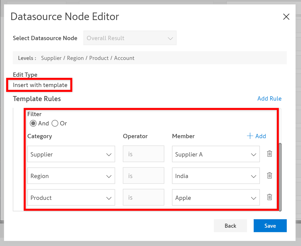 This will be applied only for *Supplier A* in *India* region for *Apple* product. These specific categories are filtered using the **Filter** option in Template Rules as shown in the image below.