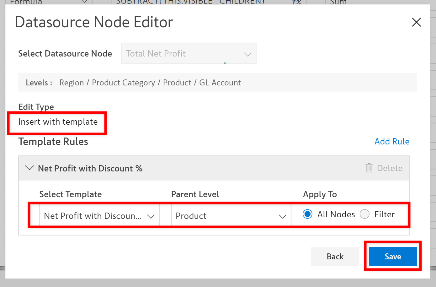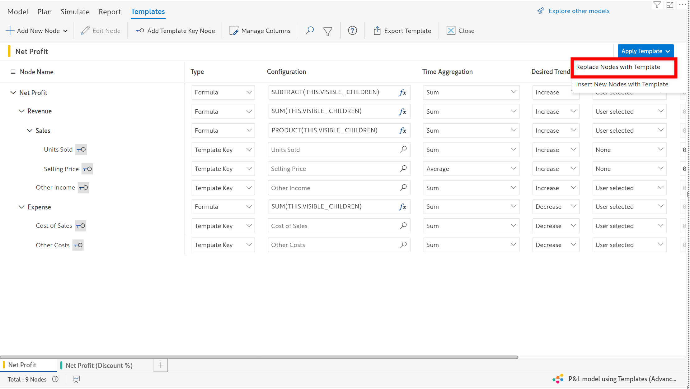 In the below example, we have created a template structure for *Net Profit with Discount%* and applied it using the **Insert with template** option for **All Nodes** under **Product** level.&#x20;