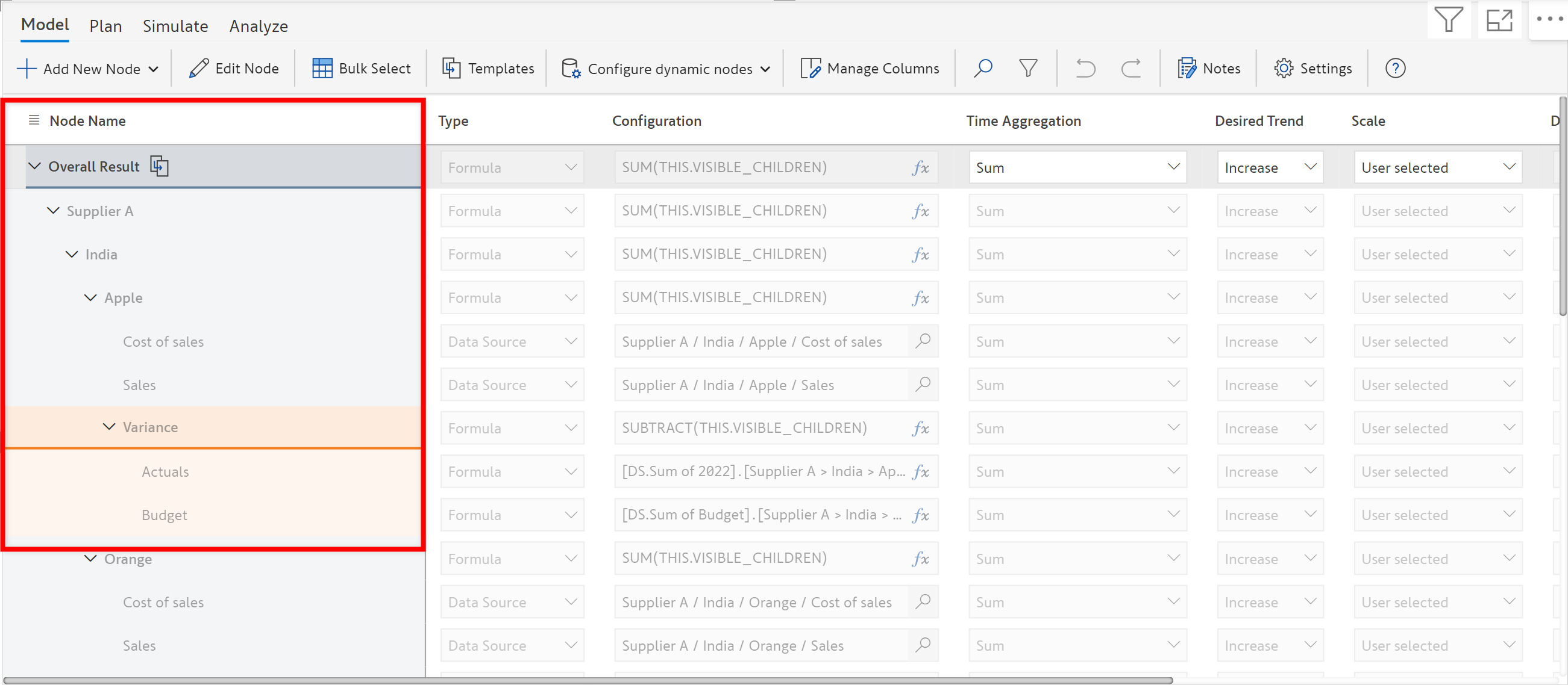 On applying this template to the model, the variance template structure gets added as a descendant of the filtered parent node (*Apple* node belonging to *Supplier A* of *India*).&#x20;