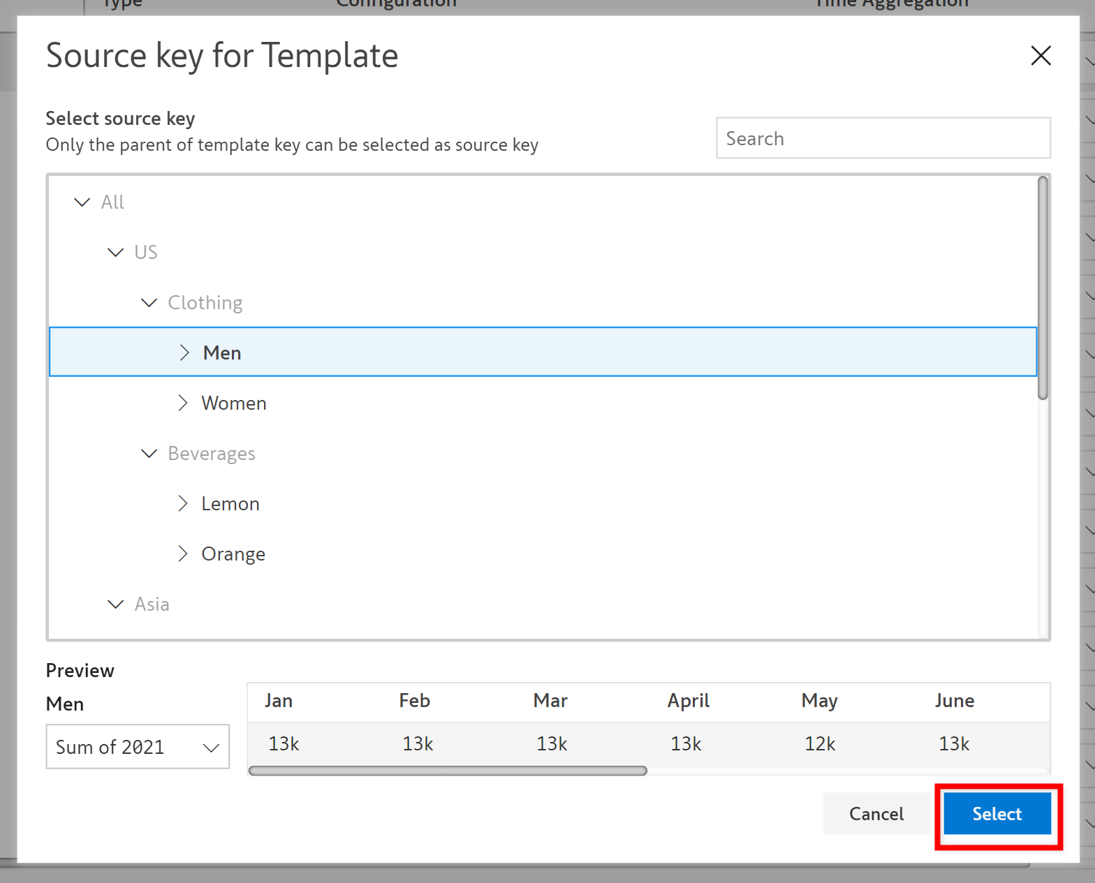5. Clicking on **Select source key** opens a pop-up where you can select the source key for template.