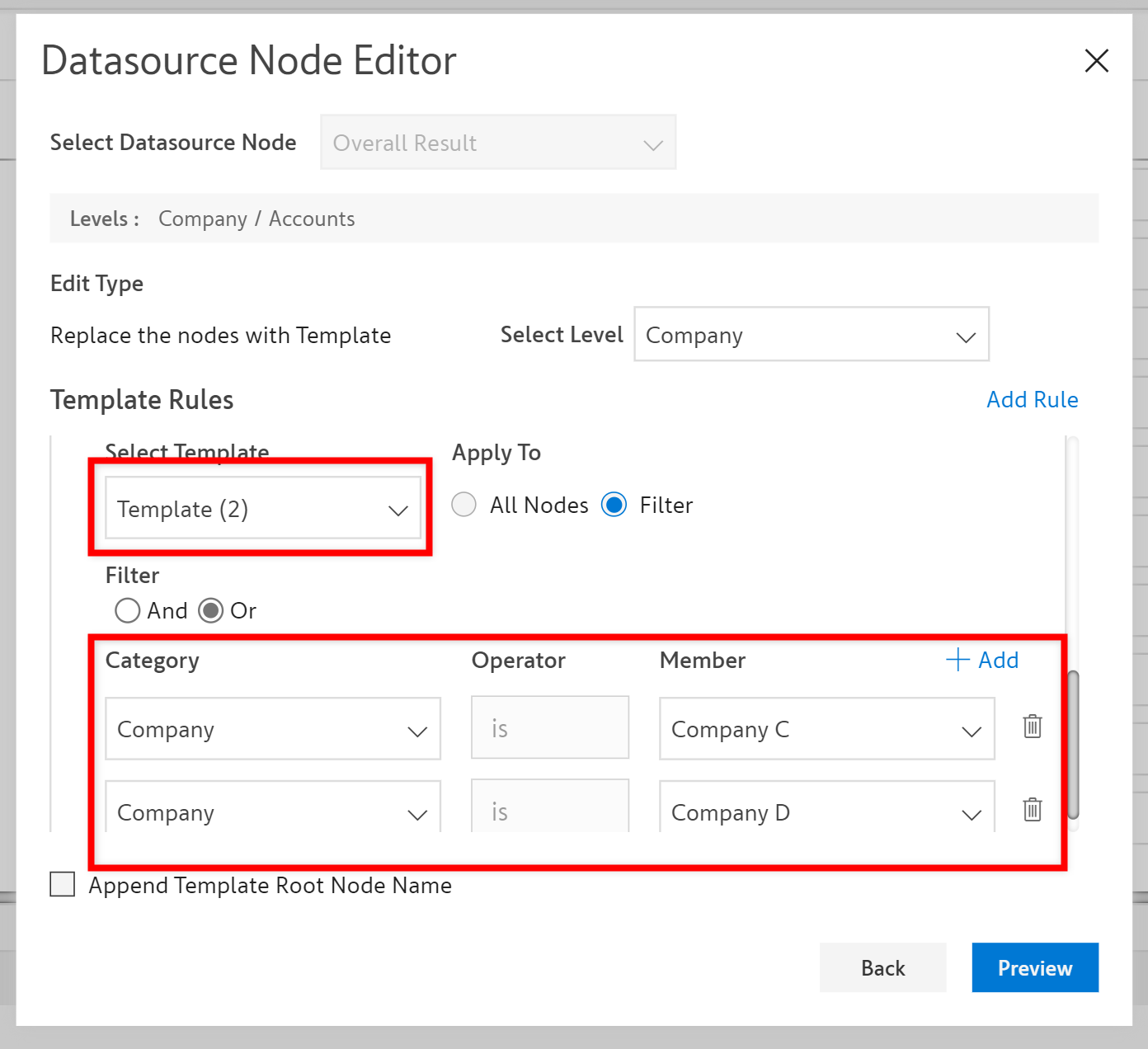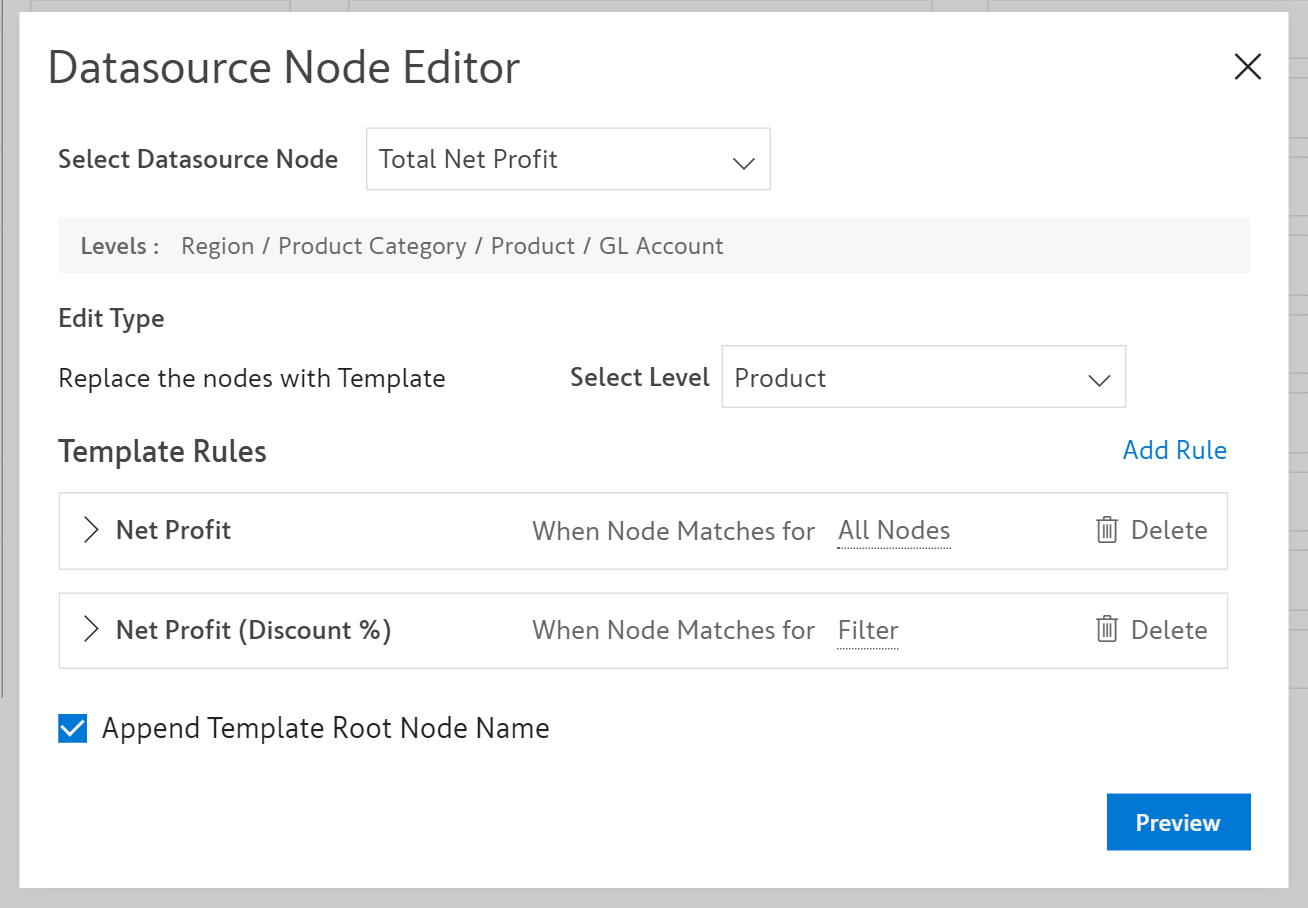 **Step 4:** The level and the template are selected. Then the template is applied to replace **all the nodes** at the ***Region*** level. Click **Preview**.