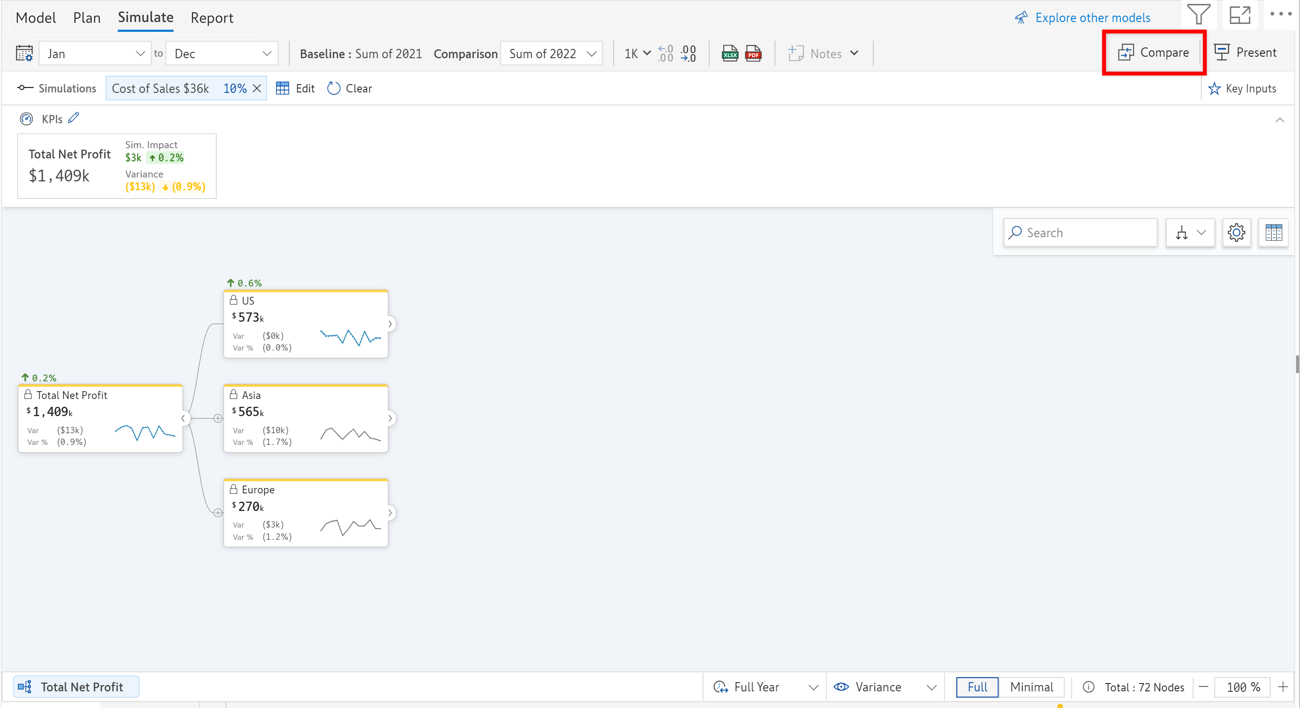 Multiple scenarios can be created, simulated and compared to perform scenario analysis. Click on **Compare** on the navigation panel to open the **Scenario Comparison** window.