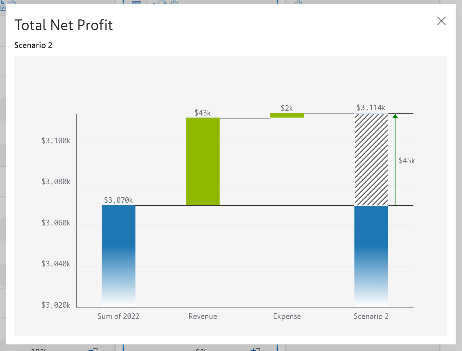 **Simulation Impact:** Clicking this icon <img src="https://261229348-files.gitbook.io/~/files/v0/b/gitbook-x-prod.appspot.com/o/spaces%2FmXNCTvPRjJZj6UunHBgb%2Fuploads%2FWaTYJiM2nQladqEUN7Vc%2Fimage.png?alt=media&#x26;token=64a6a904-60d7-491f-99b4-62de9dca38a3" alt="" data-size="line"> opens a waterfall chart showing the breakdown of the Simulation Impact on the top node for that specific scenario.