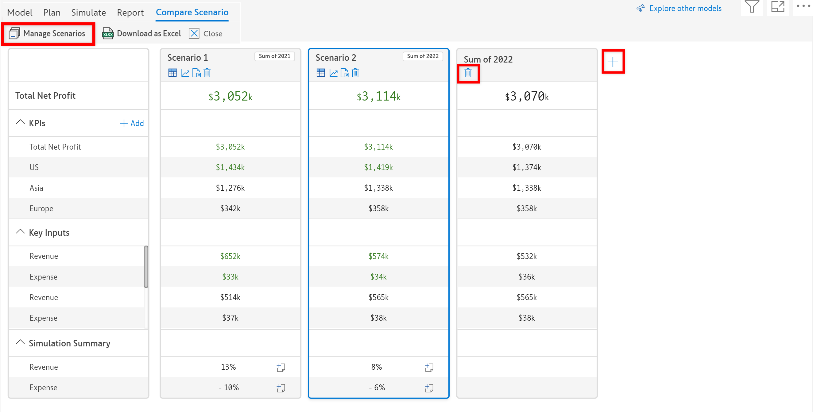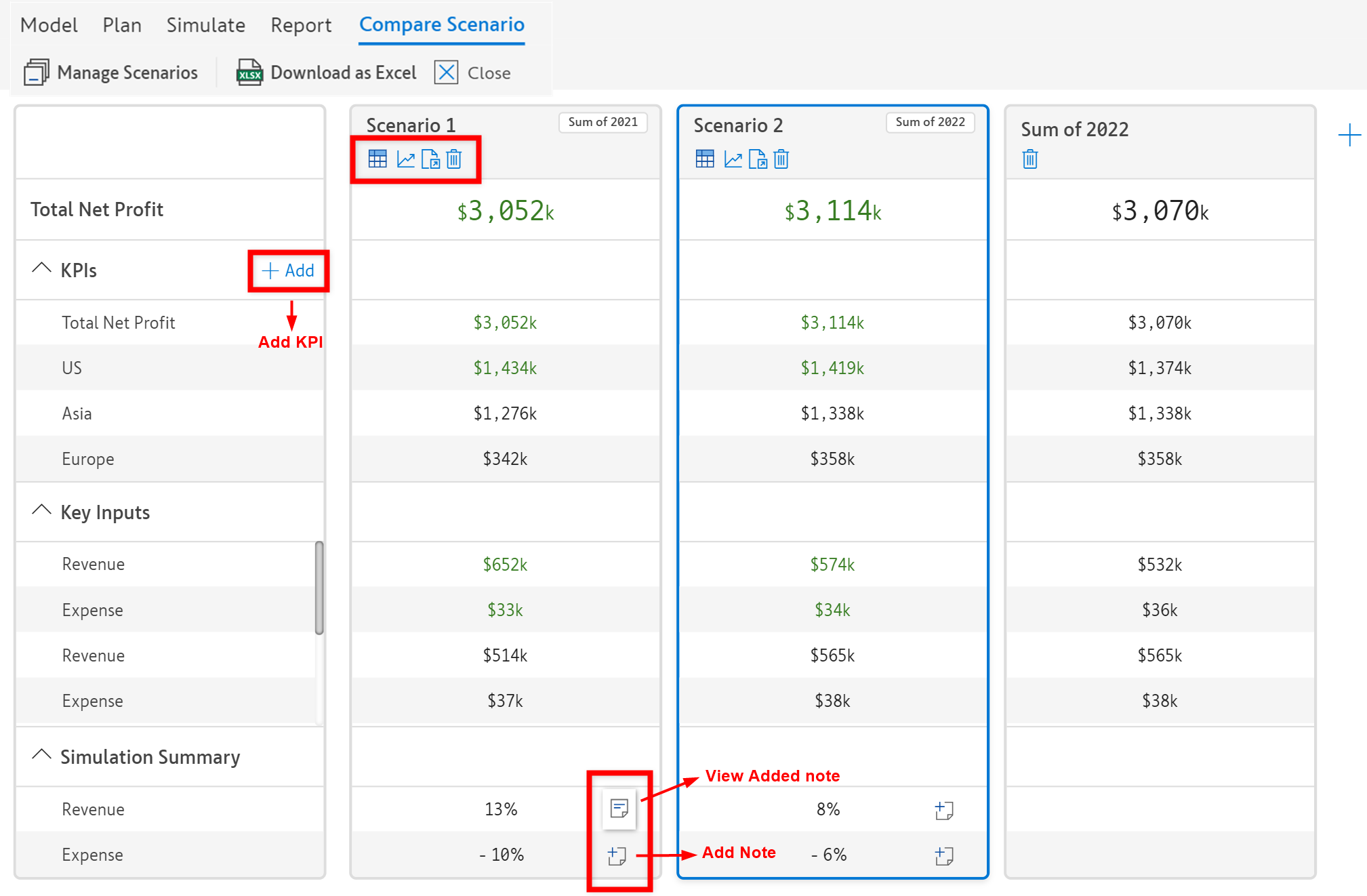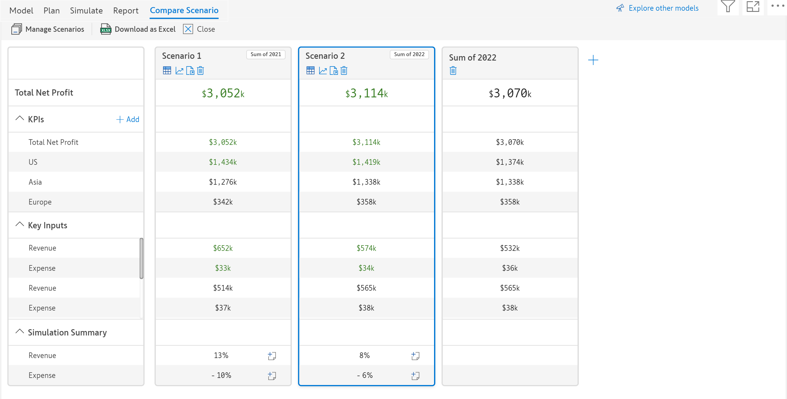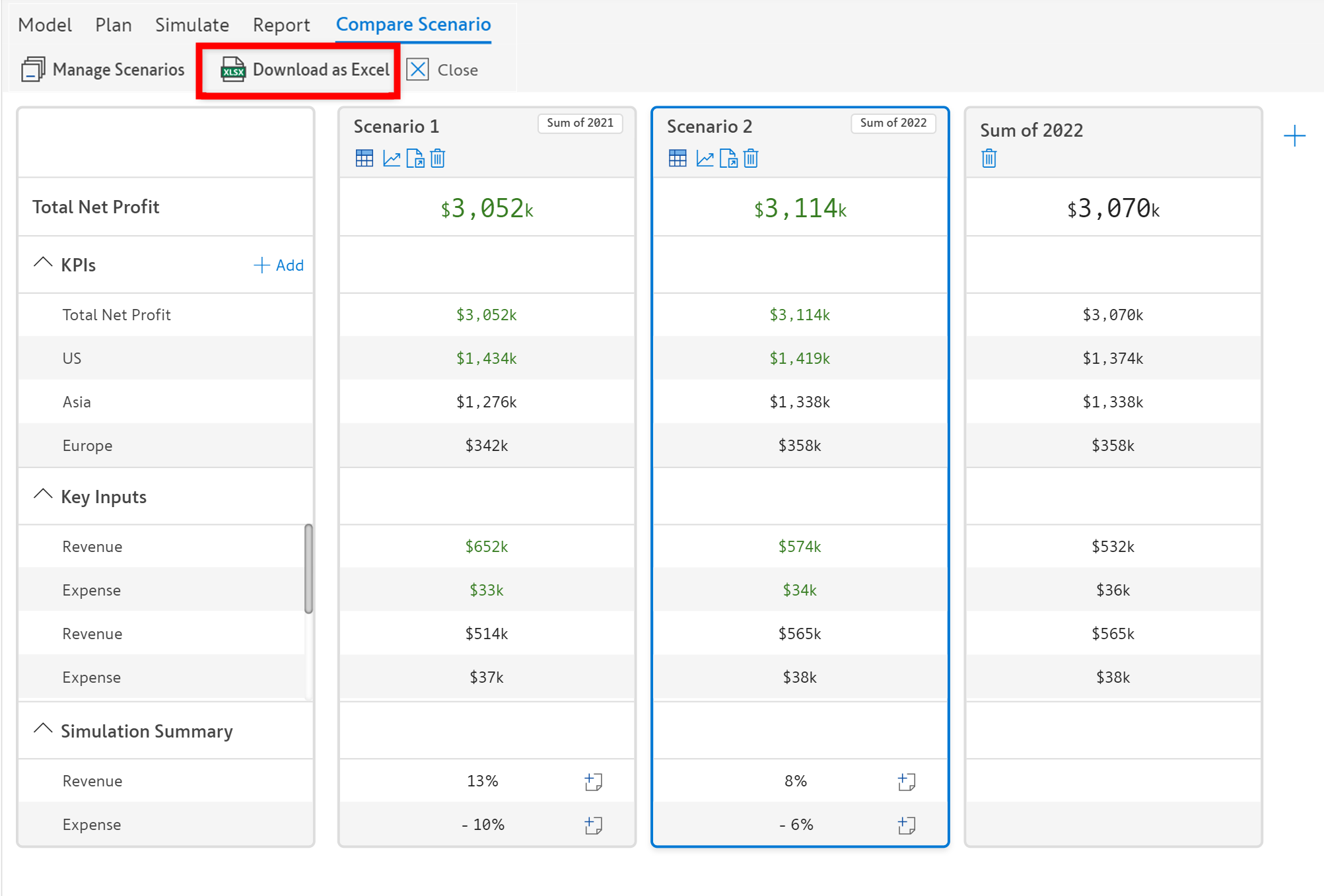 To export the scenario comparison data to Excel, click on **Download as Excel** option.