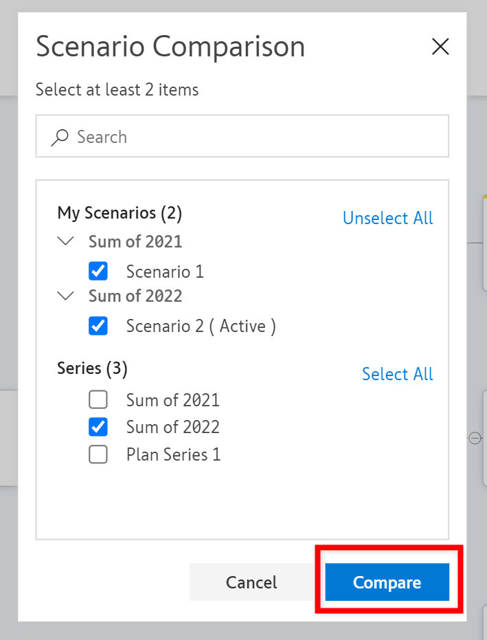 In **Scenario Comparison** pop-up, all the scenarios are listed under the baseline using which it was created, and all the series including plan series are also available for comparison. Select the required scenarios and data series that you want to compare by checking them and then click **Compare.**