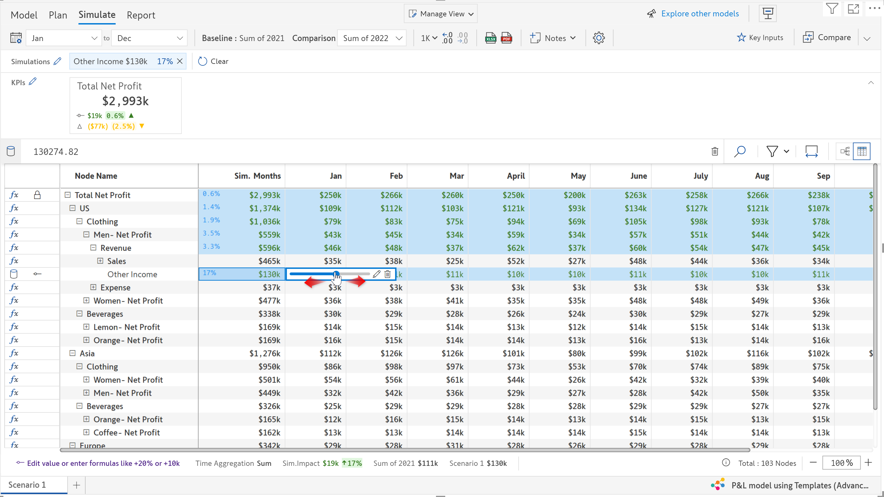 Using the simulation slider is an intuitive way to simulate the nodes. The slider is available for all the simulation methods such as Change%, Growth% and Constant.