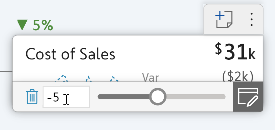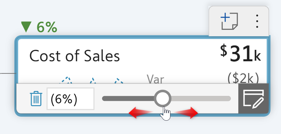 In tree view, hover over the desired node to reveal a slider. Clicking and dragging the slider changes the value in the cell. It also shows a percentage change with an up or down arrow as you keep moving the slider to the right or the left. The values and the total get updated once you release the slider.