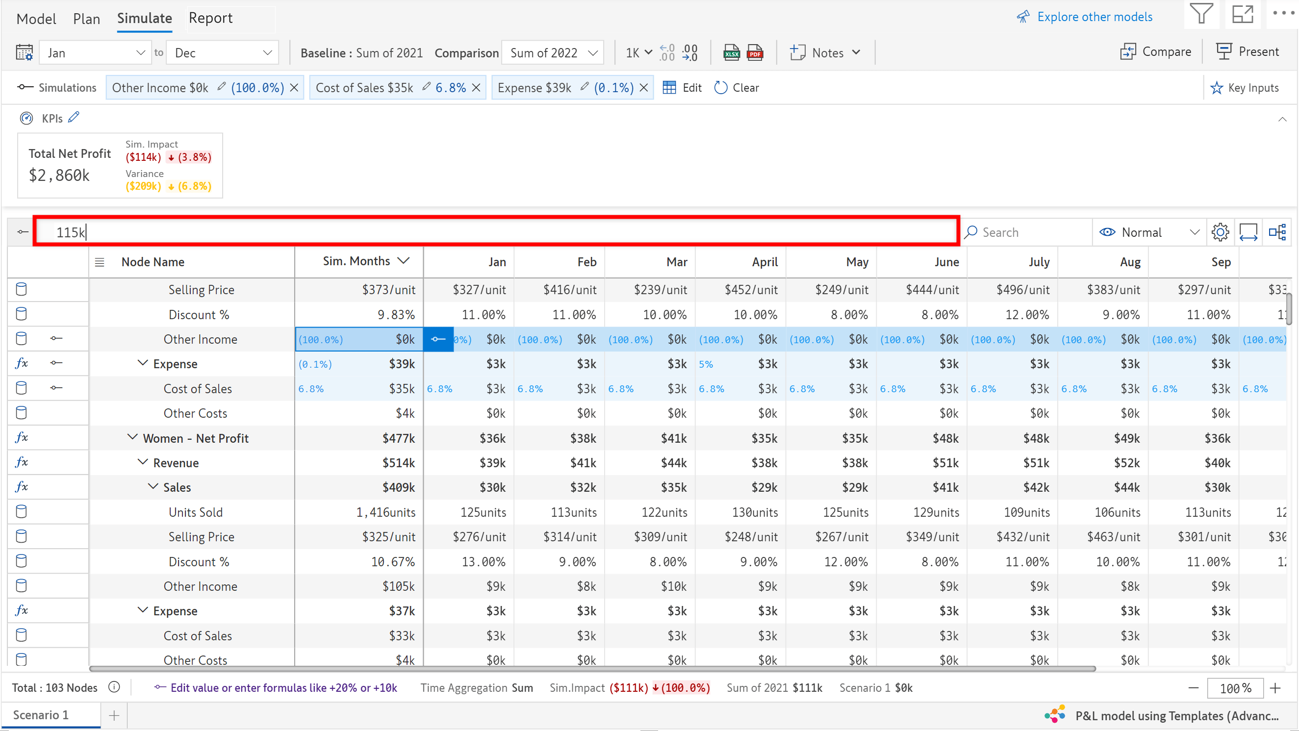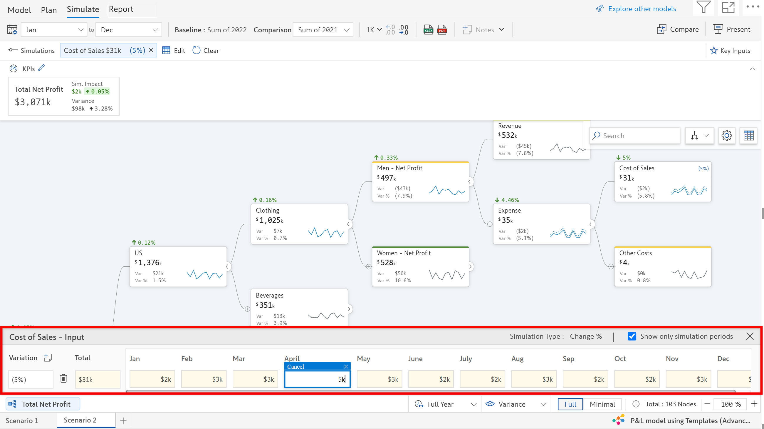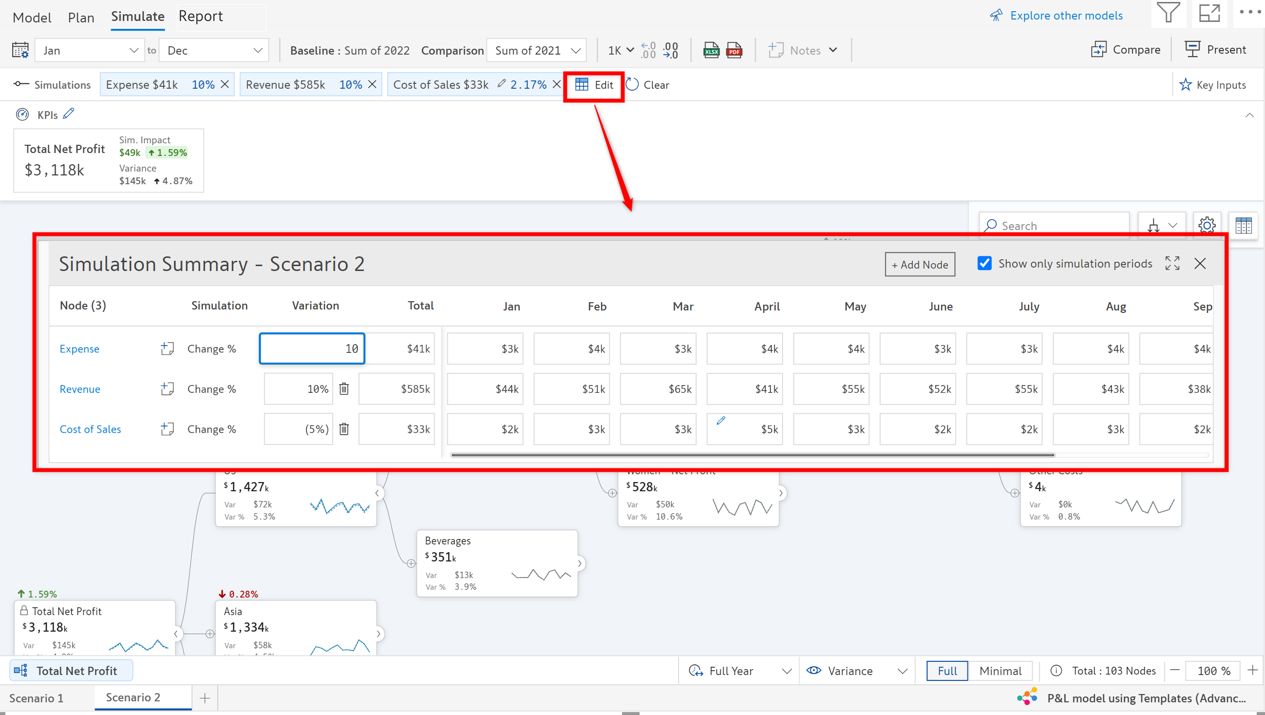 * The KPI ribbon at the top shows the new variances and the impact of simulation on the KPIs.