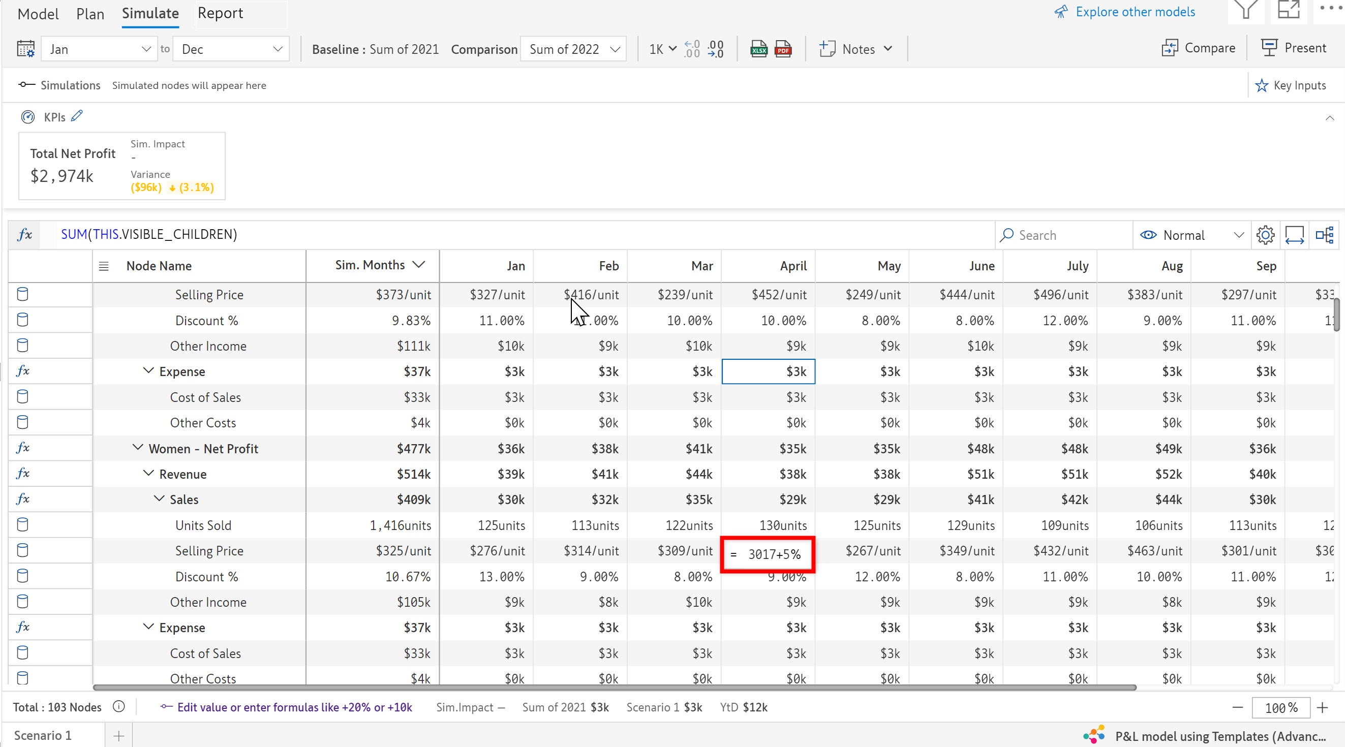 * Variance, Variance%, Simulation Impact and Simulation impact% are displayed on the table when you enable them.