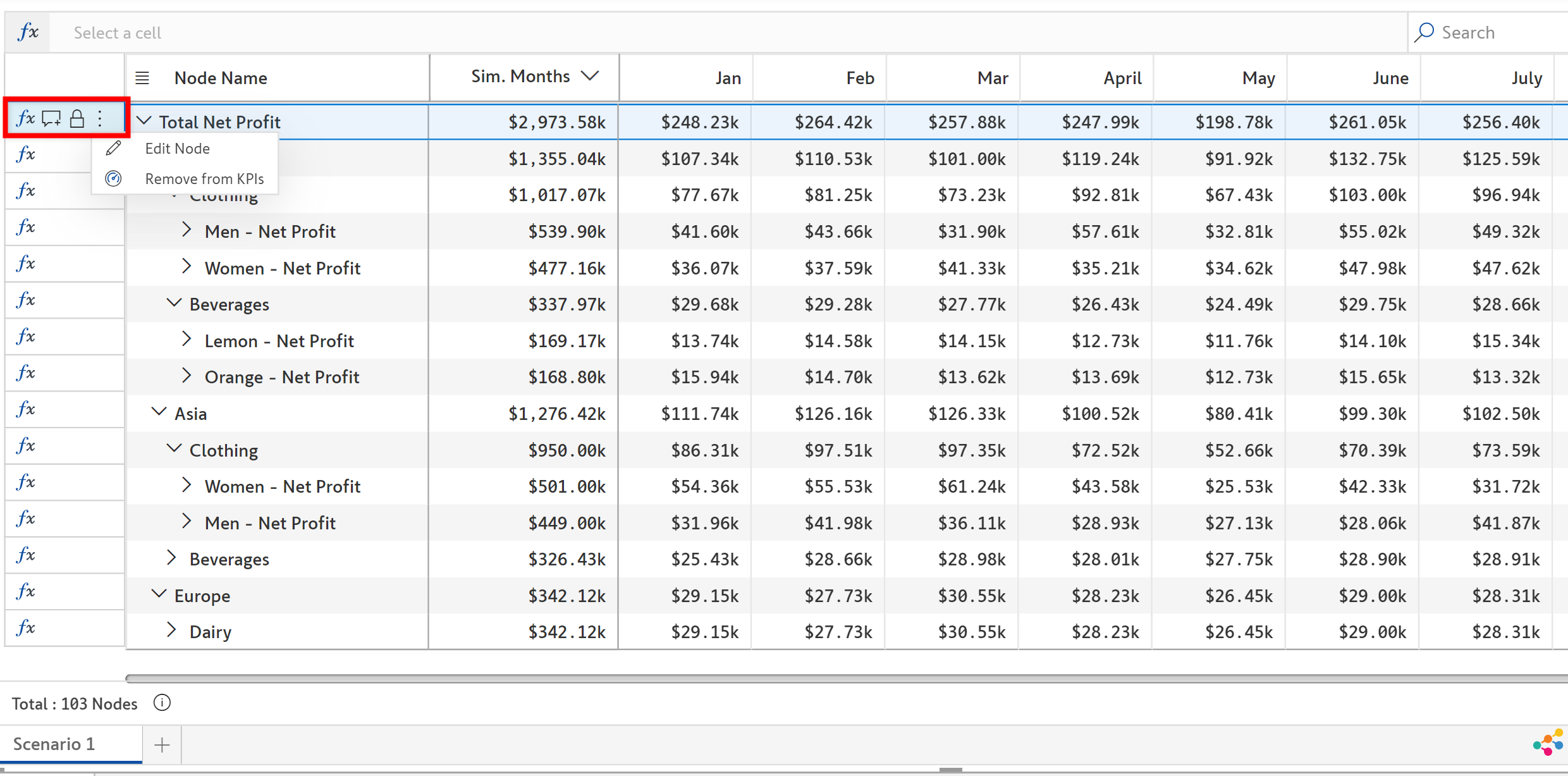 This opens a grid consisting of the total node value and the period values where you can double-click on any of the cells (total node/ variation % /individual period) to enter a new value or use expressions like +20% or +10k to edit them, similar to the in-cell editor of the [Table View](#2.2.-table-view). The Bin icon is used to reset the simulation of the particular node.