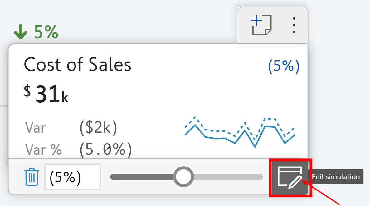 <figure><img src="https://261229348-files.gitbook.io/~/files/v0/b/gitbook-x-prod.appspot.com/o/spaces%2FmXNCTvPRjJZj6UunHBgb%2Fuploads%2FuuqSQEQ6MXfUrEwUVpSU%2Fimage.png?alt=media&#x26;token=2faa7f65-be7e-4e35-9a57-9c90e716ceea" alt="" width="375"><figcaption><p><strong>Cost of Sales simulated to decrease by 5%</strong></p></figcaption></figure>